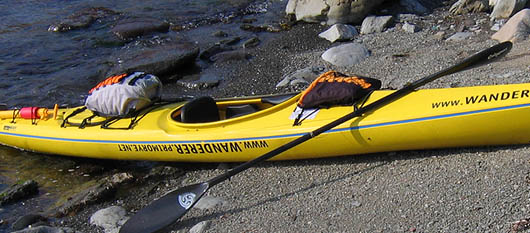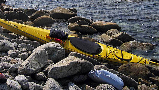 Также активно эксплуатирую самодельный чехол, сшитый из плащевки. На морских переходах лежит в сумке, не занимая много места. Если приходится высаживаться на берег с крутым склоном или крупными камнями-валунами-скалами, не надрываюсь, оставляю каяк у воды, а чтобы прибойная волна не заливала кокпит, как раз и набрасываю на него этот чехольчик. Получается полностью все закрыто, а необходимое для привала находится в отстегиваемой сумке. Пример внизу на фотографии. Так же закрываю им кокпит на ночь, чтобы разные тараканы не ползли внутрь, да возможным дождем не заливало. |