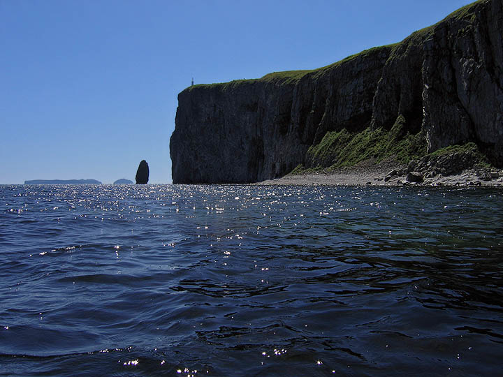 Добравшись до мыса Льва, зашел на кордон морского заповедника отметиться, а потом направился в бухту Горшкова. В красном закатном свете кекуры-камни-скалы производили потрясающее впечатление, даже, несмотря на морское волнение... или нет - это скорее усиливало мое восприятие. Правда, нерп всех смыло с мест лежки, а может у них был обеденный перерыв. Только редкие особи, высунув головы из воды, с любопытством разглядывали меня, опасливо держась на расстоянии. |