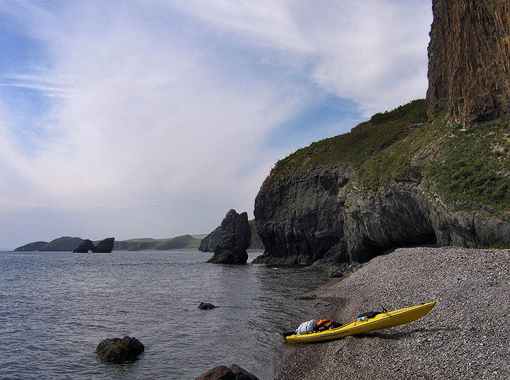 Удаляюсь и еще взгляд назад - вот оно, будущее место каякерского паломничества. Хотя, с большей вероятностью, здесь будут тусоваться пляжные каякеры, ведь в бухте напротив стоит база отдыха. |