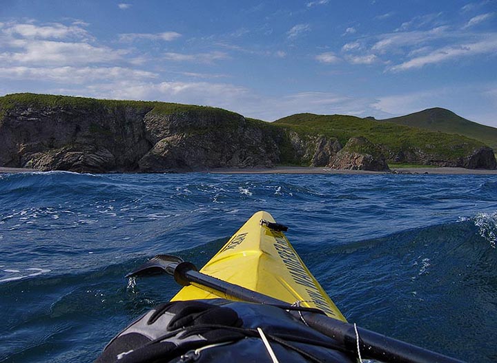 Так как я остался без фототрофеев на впечатлившем меня участке полуострова Краббе, решил еще раз посетить это место, благо крюк небольшой, и уже оттуда продвигаться к Посьету. Выйдя из своей спальной бухты, попал в попутный поток ветра и волн, что в значительной мере ускорило мое пересечение залива (максимальная скорость - 19,7 км/ч). |