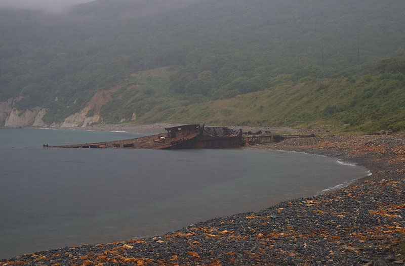 Остров подковообразный. Громадная бухта, в которую мы вошли после осмотра западной стороны, была идеальным местом для спокойного выхода на берег и, пройдя в самую глубинку, высадились вблизи истлевшего причала с пришвартованными корабельными останками. Перекусили, укрывшись от дождя в заброшенном вагончике, и, не задерживаясь, продолжили обход острова. /фото А. Лоханько/ |