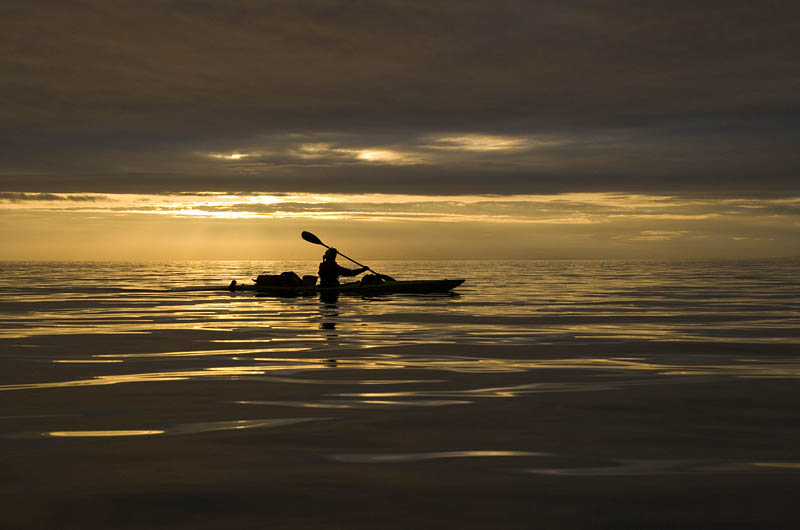 Пробившись на мысу через огроменные волны, выходим на штормующую сторону острова и, держась подальше от берега, где идет нешуточная битва между водой и камнем, направляемся к мысу Ступенчатый. Подойдя к мысу, остановился метрах в 20 от берега подождать Александра. Сижу, глубоко задумавшись, качаясь на волнах, и тут происходит нечто неуловимое, и я вдруг осознаю, что нахожусь под водой, и мои теперь уже точно глубокие мысли бегут в русле просчета вариантов выхода на поверхность. После короткой внутренней полемики решаю катапультироваться, дабы попыткой эскимоса не сломать солнечную батарею, уютно так свернувшуюся у меня точно между бедром и упором лодки, тем более, подумал я, до берега всего ничего. Оказавшись на поверхности, для начала глотнул воздуха, затем перевернул лодку, закидал расплывающееся добро обратно в кокпит, и погреб уже руками к берегу, подталкивая каяк. Изрядно поборовшись в беснующейся прибойной полосе с потяжелевшей и ставшей абсолютно неуправляемой лодкой, всё-таки затащил ее по склону наверх подальше от воды, где уже и привел все в порядок для короткого броска к месту стоянки. |
