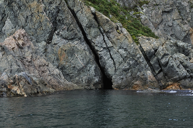 Моросит. Дождевая пыль, оседая на поверхность моря, шуршит, словно не настроенный приемник. Угрюмые мокрые скалы с застрявшими на вершинах лохмотьями тумана и мы такие же мокрые, перебирая веслами воду, шествуем вдоль... Такое вот кино крутилось на закрытой от ненастья стороне острова. |