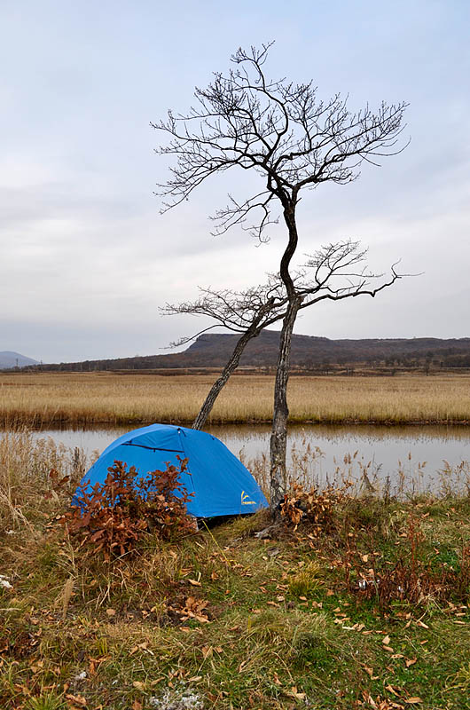 Утро. Вот так я вписался со своей палаткой в местный ландшафт.