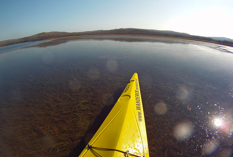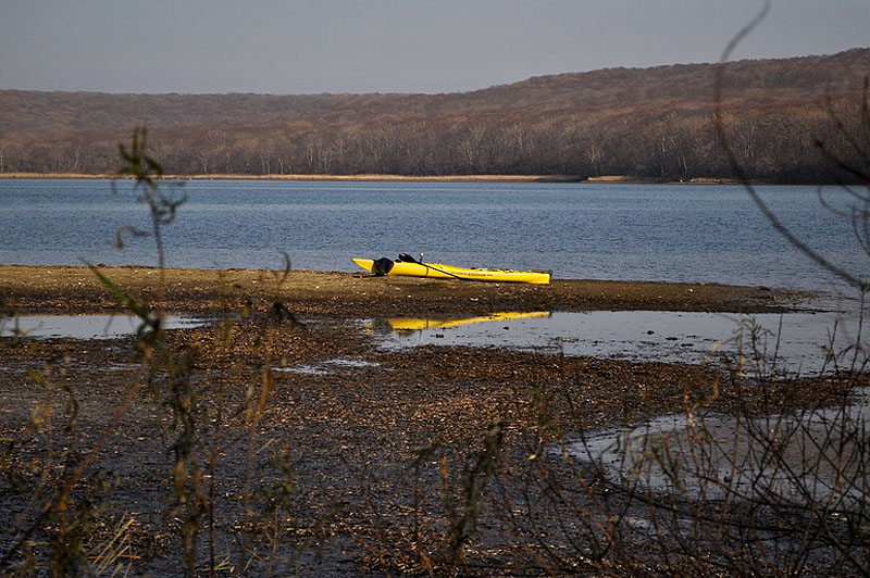 Каяк уже лежит своим желтым брюшком на илистом дне, а впереди еще несколько десятков метров водной поверхности.
