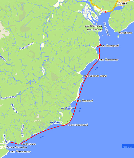 За Уссурийском свернули на ветку, пересекающую Приморье с запада на восток и уже по ней так и двигались, сделав по пути пару остановок – ночной перекус в придорожной таверне, да под утро вздремнули немного, припарковавшись на обочине. В полдень прибыли в Ольгу. |