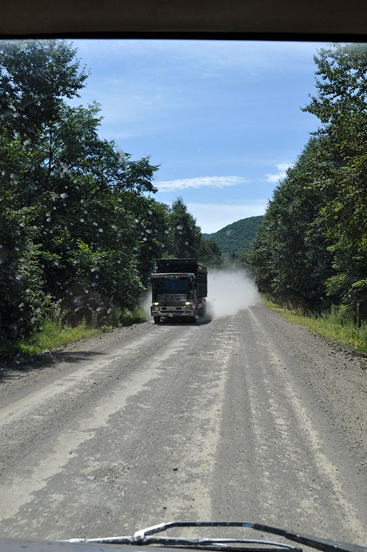 В обратный путь через Лазо с заездом в Моряк-Рыболов. Дорога – грунтовка, местами сильно разбитая. Лодку, несмотря на ее "привязанность" к кузову, периодически подбрасывало, что в конечном итоге обернулось фрагментарным расплющиванием крепления пера руля – ничего фатального. Скажем так, каяку был нанесен непоправимый ущерб эстетического характера, а мне, в связи с этим, моральный. |