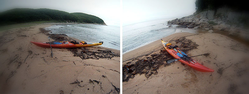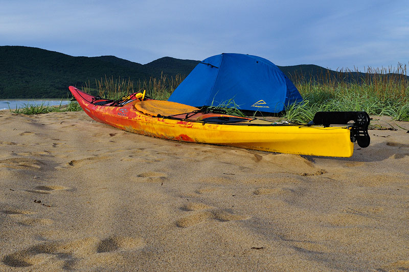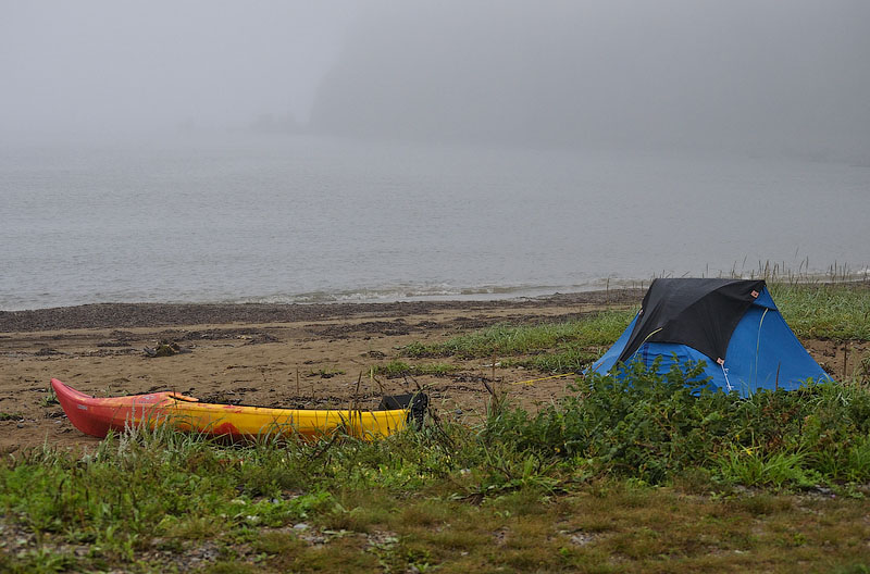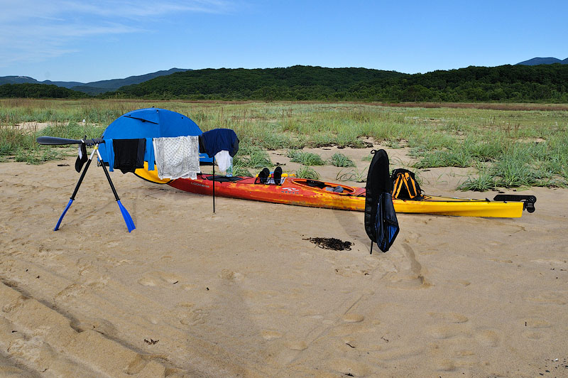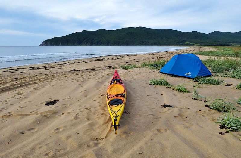 Выгрузились по прибытии в поселок на первом же съезде к морю. Оставшись наедине со своим имуществом, решил все-таки уйти с продуваемого участка под прикрытие мыса Часовой, что на другой стороне бухты. Идти достаточно, взялся было за переноску лодки, взвалил на плечо как меня тут же развернуло как флюгер по ветру, жаль только мне не в ту сторону надо было, а так долетел бы быстро. На этом оставил попытки самостоятельной переброски, созвонился с Сергеем (познакомились прошлым летом, оставлял у него машину в поселке на время моего перехода до Находки) и он перевез сумки, заодно, по моей просьбе, привез питьевой воды, которую я так по пути и не купил, как планировал. Каяк провел к мысу по воде, где уже и развернул свой лагерь по соседству с парой стоявших здесь компаний. Время – 21:00. После суток, проведенных в дороге, тело требует отдыха. Укладываюсь с настроем подняться на восходе. Через минут десять хлынул дождь...