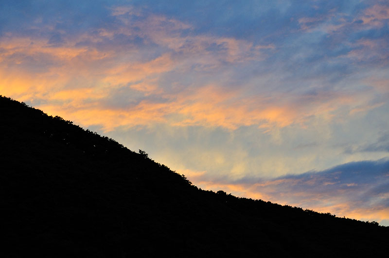 Высадился и сразу понял, что здесь я останавливаться не буду. Прямо так в голове и сформировалась – «садись обратно в каяк и найди себе другое место». Речка, вплотную обступающий лес и повсюду множество следов, как копытных, так и когтистых зверюшек – и все это, погружающееся в ночную темень. Еще и к тому же чуть не сбив с ног, налетела местная агрессивно настроенная мошка и, облепив меня, а я был, напомню в шортах и футболке, принялась с остервенением кормиться мною прямо как в последний раз. Морщась от очередного прокусывания, я, пытаясь прекратить это гастрономическое пиршество, наносил по себе мощные точечные удары, а затем для профилактики скользил ладонями по всему телу, сгоняя пристроившихся кровожадных гнусов. Таким образом, танцевально двигаясь, я, в конце концов, вернулся в лодку и отправился на поиски более душевного места. Оказавшись снова на воде, застал фееричное цвето-свето-облачное представление. |