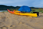 Ночью замерз. Да, да замерз, несмотря на август месяц. Утром бодренько подскочил, оценил сложившиеся условия как вполне благоприятные для выхода и сразу же взялся за сборы. Правда, моя активность особо не повлияла на их продолжительность. Мало того, что в первый день у меня естественно тратится больше времени на размещение багажа, чем в последующие, так еще и прибавилось то, что я впервые выходил в режиме экспедиции (большой объем груза) на новом каяке, и поэтому пришлось дополнительно повозиться с оптимизацией укладки, подстраиваясь под несколько иную специфику загрузки относительно моей старой лодки. Надо заметить, мое беспокойство по части вместимости Лукши оказалось напрасным, и захваченный 80-ти литровый драйбег, который я намеревался закрепить на деке для увеличения полезного объема, не пригодился, все прекрасно уместилось внутри каяка, и драйбег в том числе. |