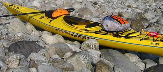 Также активно эксплуатирую самодельный чехол, сшитый из плащевки. На морских переходах лежит в сумке, не занимая много места. Если приходится высаживаться на берег с крутым склоном или крупными камнями-валунами-скалами, не надрываюсь, оставляю каяк у воды, а чтобы прибойная волна не заливала кокпит, как раз и набрасываю на него этот чехольчик. Получается полностью все закрыто, а необходимое для привала находится в отстегиваемой сумке. Пример внизу на фотографии. Так же закрываю им кокпит на ночь, чтобы разные тараканы не ползли внутрь, да возможным дождем не заливало. |