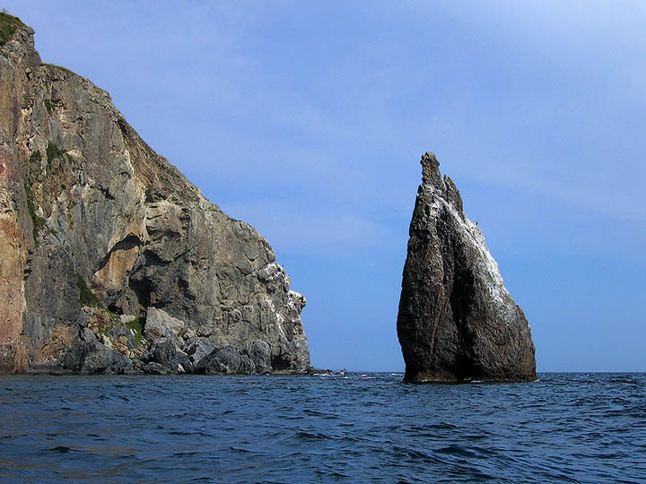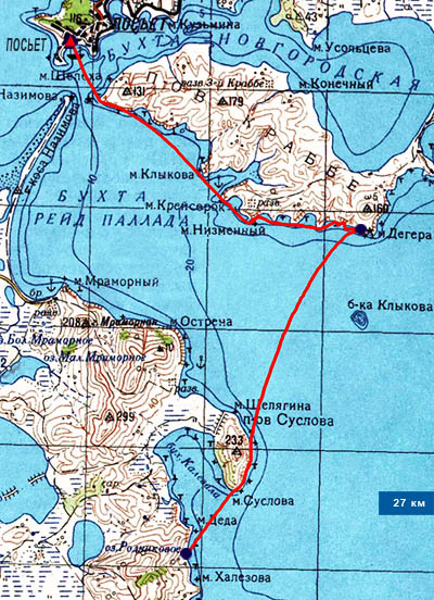 Так как я остался без фототрофеев на впечатлившем меня участке полуострова Краббе, решил еще раз посетить это место, благо крюк небольшой, и уже оттуда продвигаться к Посьету. Выйдя из своей спальной бухты, попал в попутный поток ветра и волн, что в значительной мере ускорило мое пересечение залива (максимальная скорость - 19,7 км/ч). |