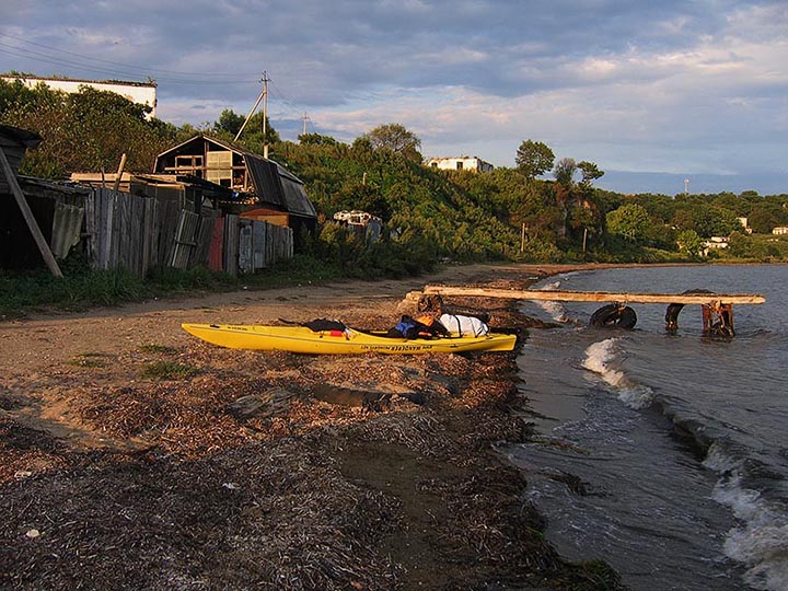 Зато на берег высадился в благоприятных условиях тихой поселковой бухточки, к тому же облака пропустили несколько лучей закатного солнца, тем самым украсив завершение морской части моего путешествия.