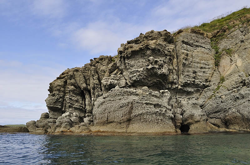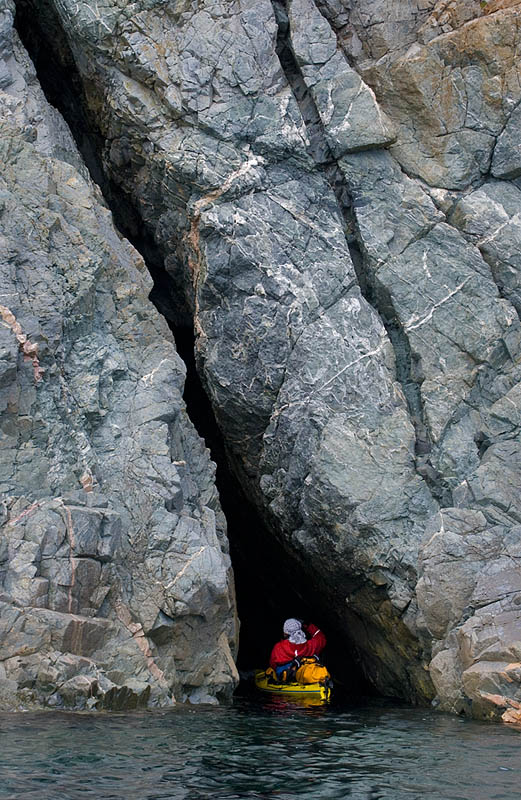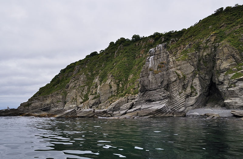 Моросит. Дождевая пыль, оседая на поверхность моря, шуршит, словно не настроенный приемник. Угрюмые мокрые скалы с застрявшими на вершинах лохмотьями тумана и мы такие же мокрые, перебирая веслами воду, шествуем вдоль... Такое вот кино крутилось на закрытой от ненастья стороне острова. |