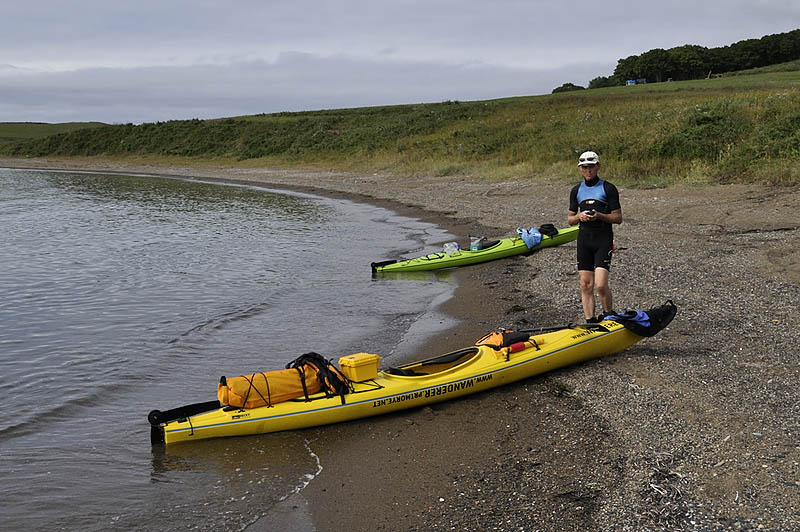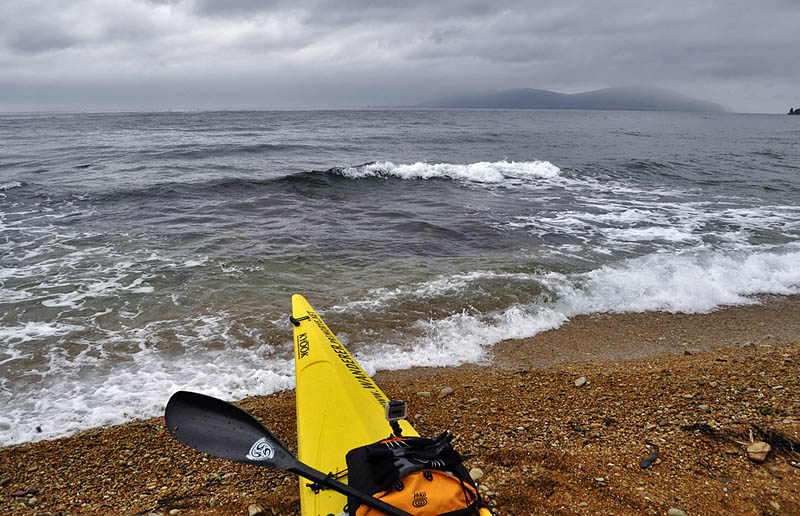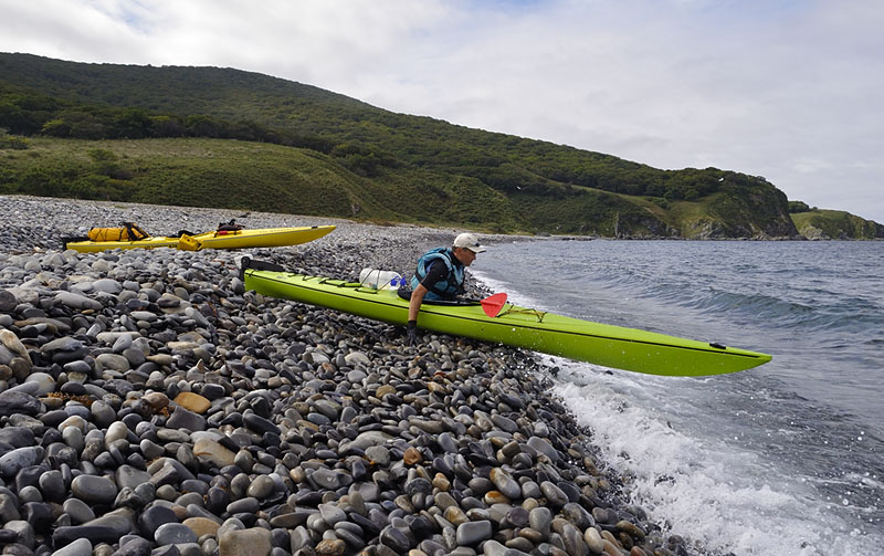 Пробившись на мысу через огроменные волны, выходим на штормующую сторону острова и, держась подальше от берега, где идет нешуточная битва между водой и камнем, направляемся к мысу Ступенчатый. Подойдя к мысу, остановился метрах в 20 от берега подождать Александра. Сижу, глубоко задумавшись, качаясь на волнах, и тут происходит нечто неуловимое, и я вдруг осознаю, что нахожусь под водой, и мои теперь уже точно глубокие мысли бегут в русле просчета вариантов выхода на поверхность. После короткой внутренней полемики решаю катапультироваться, дабы попыткой эскимоса не сломать солнечную батарею, уютно так свернувшуюся у меня точно между бедром и упором лодки, тем более, подумал я, до берега всего ничего. Оказавшись на поверхности, для начала глотнул воздуха, затем перевернул лодку, закидал расплывающееся добро обратно в кокпит, и погреб уже руками к берегу, подталкивая каяк. Изрядно поборовшись в беснующейся прибойной полосе с потяжелевшей и ставшей абсолютно неуправляемой лодкой, всё-таки затащил ее по склону наверх подальше от воды, где уже и привел все в порядок для короткого броска к месту стоянки. |