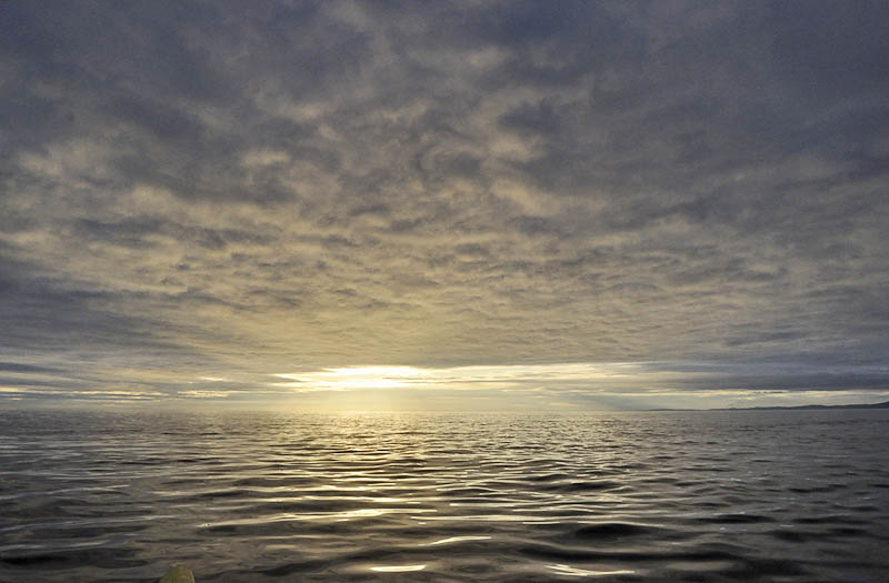 Низкая облачность, подсвеченная закатным солнцем, словно материализовавшаяся рельефная субстанция нависла над поверхностью моря, и от этого все пространство оказалось зажатым между этими двумя бескрайними плоскостями. Впечатляюще масштабное зрелище. |