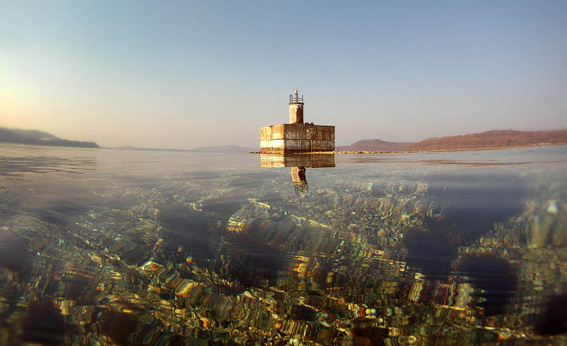 Первая приманка для заходящих в бухту каякеров – минималистическое сооружение из бетона, возведенное на подводной возвышенности в нескольких сотнях метров от канала. Пройти невозможно :). |