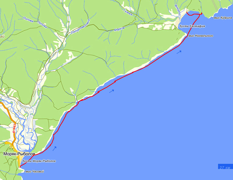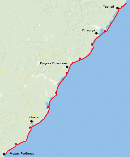 За Уссурийском свернули на ветку, пересекающую Приморье с запада на восток и уже по ней так и двигались, сделав по пути пару остановок – ночной перекус в придорожной таверне, да под утро вздремнули немного, припарковавшись на обочине. В полдень прибыли в Ольгу. |