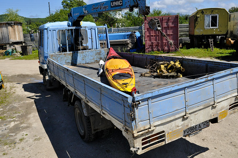 В обратный путь через Лазо с заездом в Моряк-Рыболов. Дорога – грунтовка, местами сильно разбитая. Лодку, несмотря на ее "привязанность" к кузову, периодически подбрасывало, что в конечном итоге обернулось фрагментарным расплющиванием крепления пера руля – ничего фатального. Скажем так, каяку был нанесен непоправимый ущерб эстетического характера, а мне, в связи с этим, моральный. |