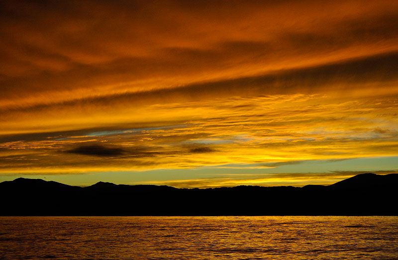 В каяке посередине бухты. Тихо. Наверху полыхает, внизу по водной поверхности растекается отражение этого процесса. Масштабность происходящего поражающая. |