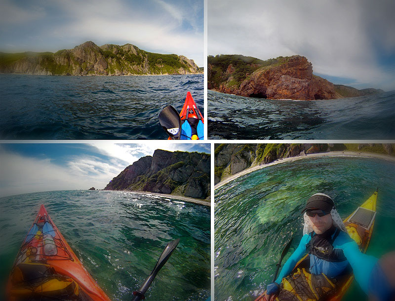 Обогнув мыс и выйдя на открытое пространство, упираюсь во встречную волну и ветер, сразу вспомнился прошлогодний маршрут отсюда же, только в противоположную сторону, тогда если ветер включался, то он был обязательно встречный и довольно сильный, а временами и совсем экстремальный. «Ладно, прорвемся» – ободряюще сказал я сам себе и переключился на осмотр проплывающих мимо меня видов. Вода, надо заметить, здесь освежающая, моя бывалая юбка начала протекать, а так как я был в серферских шортах, то сразу это почувствовал. В последующие дни на мне уже были каякерские непромокаемые, и чувство досады, что оставил новую юбку дома, посчитав, что еще не пришло ее время, больше меня не тревожило. |